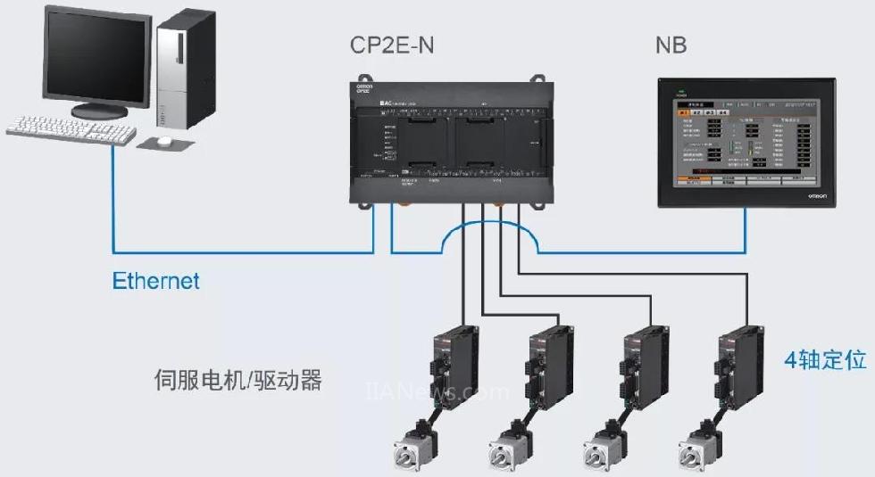 使用CP2E定位功能內置的4軸100k Hz脈沖輸出功能、直線插補功能,可實現(xiàn)搬運的自動化。