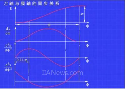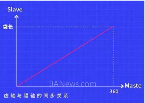 以一根虛軸作為主軸,刀軸與虛軸之間通過建立飛剪的電子凸輪關(guān)系,實(shí)現(xiàn)飛剪動(dòng)作。膜軸始終保持勻速運(yùn)行,主虛軸運(yùn)行一圈,膜軸運(yùn)行一個(gè)袋長(zhǎng),刀軸也運(yùn)行一圈。