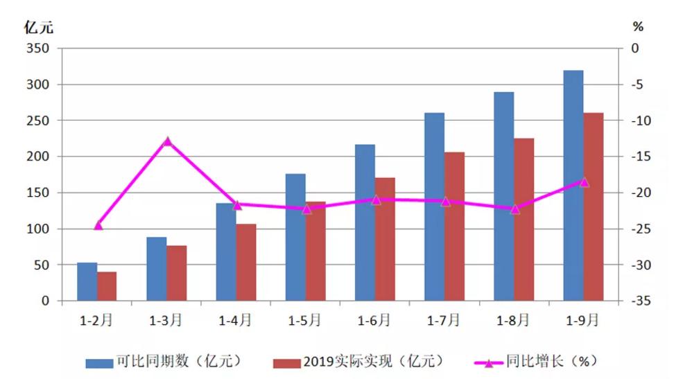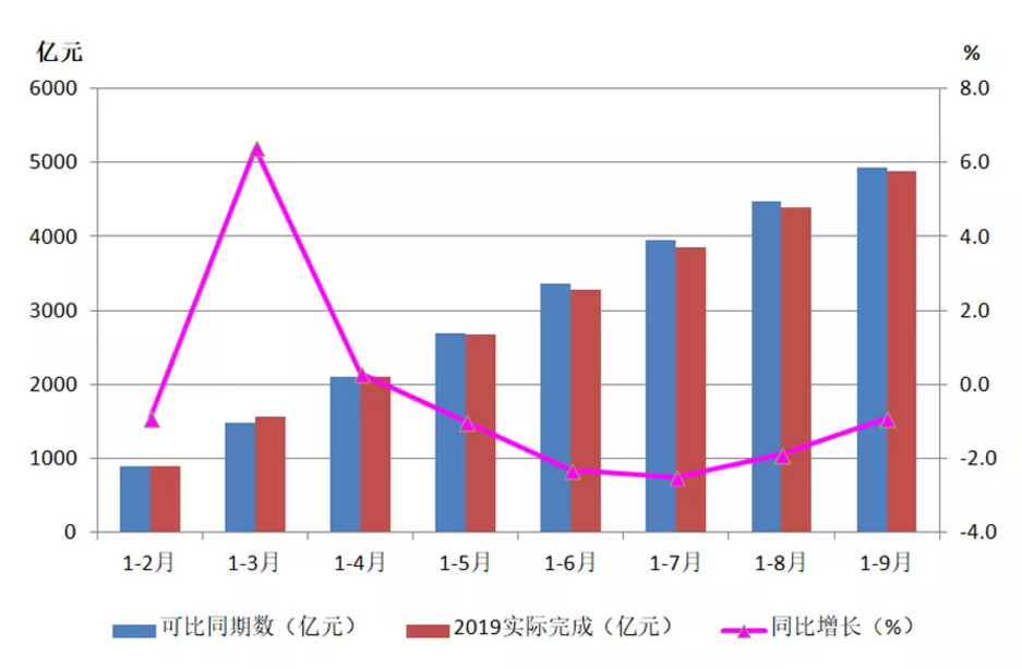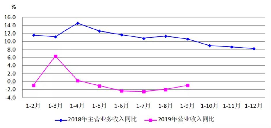 圖2為今年1—9月?tīng)I(yíng)業(yè)收入同比變化與2018年主營(yíng)業(yè)務(wù)收入同比變化的對(duì)比。由圖可見(jiàn),2018年4月達(dá)到14.6%的高點(diǎn)之后進(jìn)入波動(dòng)下行,但年末仍保持了8.3%的同比增長(zhǎng)。而今年除3、4月為累計(jì)同比增長(zhǎng)之外,其后月份一直為同比下降,7月后下降幅度有所減緩,但今年前三季度行業(yè)下行壓力比去年感受更為明顯。