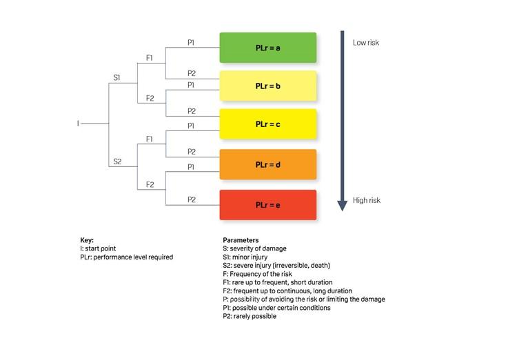 風險圖用于確定指定安全功能所需的性能級別(PLr)。如果 AMR 系統(tǒng)發(fā)生故障,可能會對人造成嚴重的傷害,因此大多數(shù)安全功能都需要達到 PLd 級。