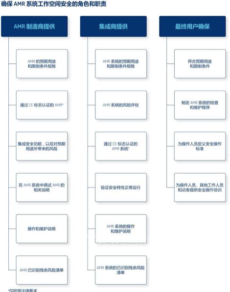 AMR制造商主要承擔安裝階段的調試、技術培訓、指導,以及對AMR的產品設計及質量保證證明。進入安裝階段后,AMR系統(tǒng)集成商(如果用戶選擇自行集成機器人,則可能是最終用戶)負責安裝,提供充足的操作信息,識別或解決所有風險,預測潛在隱患;對機器人進行編程,使其能夠遵守安全標準,并在安裝過程中對AMR系統(tǒng)進行風險評估。部署AMR系統(tǒng)之后,終端用戶將負責制定并遵循AMR系統(tǒng)的操作和維護程序。最終用戶應規(guī)范安全操作程序,并向操作人員、其他工作人員和訪客提供安全操作培訓。