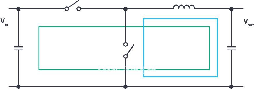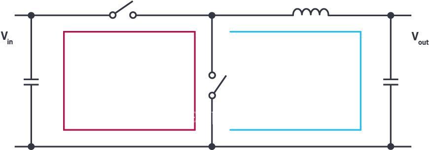 開關穩(wěn)壓器中需要不斷開關電流。這些電流通常比較大。每當電流流動時,會產(chǎn)生磁場。如果快速開關大電流,就會產(chǎn)生交變磁場。此外,如果開關電流時,路徑中存在寄生電感,就會產(chǎn)生電壓失調(diào)。電流會容性耦合到相鄰的電路部件中,并增加電源的噪聲輻射。綜上所述,我們可以說開關電流是導致開關模式電源產(chǎn)生噪聲的主要原因。圖1顯示了簡化的降壓轉(zhuǎn)換器拓撲結構。所有存在連續(xù)電流的線路都用藍色表示。所有快速開關電流的線路都用紅色表示。