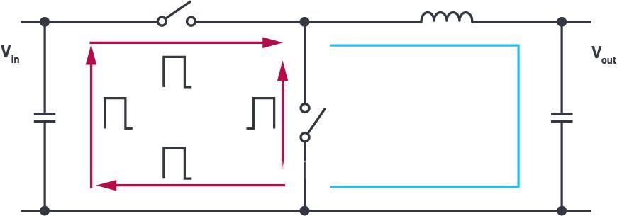 圖1中的紅色線路是關鍵線路。它們看起來像一個電流回路,因此被稱為回路。熱回路意味著這個回路特別關鍵,因為它涉及到快速開關電流。如果我們仔細觀察這個回路,可以看到圖1中的紅色回路從來沒有真正的電流流過,這個因為兩個開關從來不會同時打開。它只是單條線路的組合,在特定時間會有電流流過,在其他時間則沒有電流流過。在圖2中,各連接線路旁的箭頭表示電流流動的方向。同時,通過指定的符號表示電流流過的時間。在其他時間,沒有電流流經(jīng)該導體。