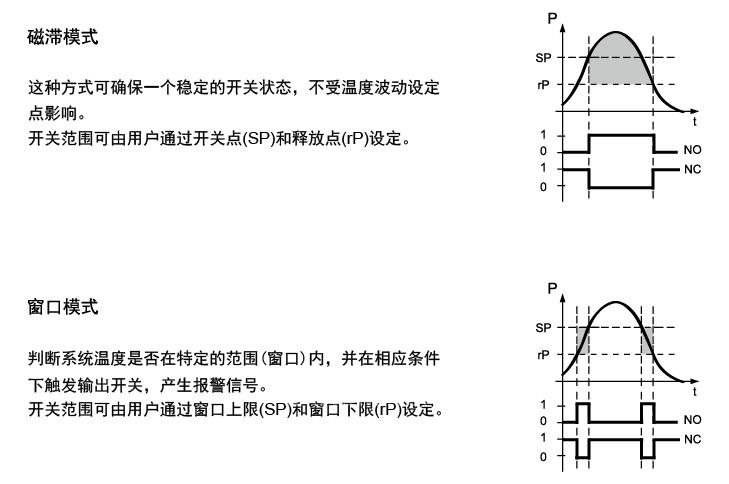 傳感器可輸出兩路獨(dú)立的開關(guān)量和一路模擬量。通過三個(gè)編程按鈕,用戶可以十分簡單且快速地自行設(shè)定溫度報(bào)警點(diǎn)的輸出模式:磁滯模式或窗口模式。這兩路開關(guān)量輸出的數(shù)值分別對應(yīng)為用戶設(shè)定的SP值和rP值。
