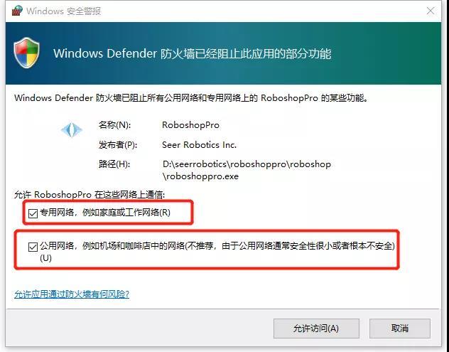 使用 Roboshop Pro 的過程中如遇到 Windows 防火墻警告,請(qǐng)按照下圖同時(shí)勾選 [專用網(wǎng)絡(luò)] 和 [公用網(wǎng)絡(luò)] ,并點(diǎn)擊【允許訪問】。若只勾選了一個(gè),可能會(huì)導(dǎo)致計(jì)算機(jī)連接到其他網(wǎng)絡(luò)時(shí) Roboshop Pro 的部分功能無法正常使用。如果有其他殺毒軟件或防火墻彈出攔截,也請(qǐng)點(diǎn)擊允許。