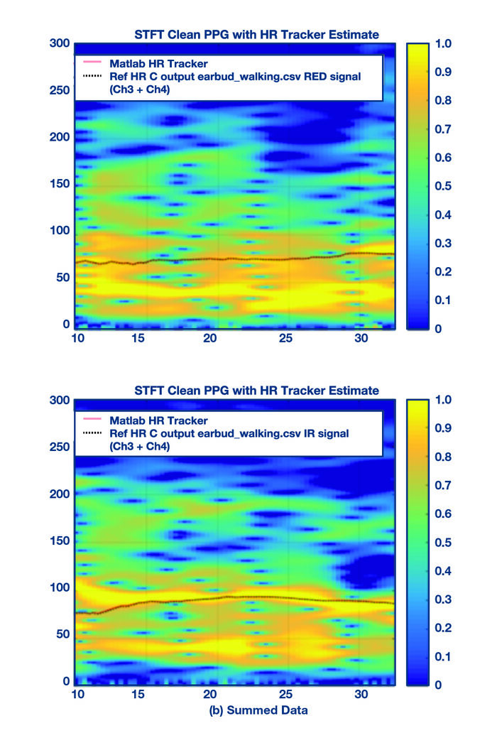 圖6.紅色區(qū)域(頂部)顯示步行情況的四通道測量,而紅外區(qū)域(底部)顯示原始數(shù)據(jù)和加總數(shù)據(jù)。心率(黑線)可以由算法通過加總數(shù)據(jù)確定,色標(biāo)指示置信度。對于紅外情況,心率可以在沒有加速度計的情況下予以確定。