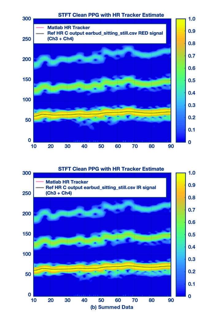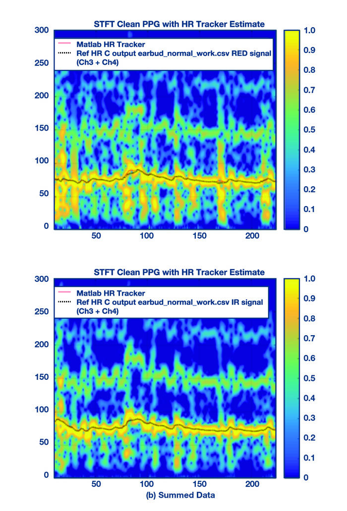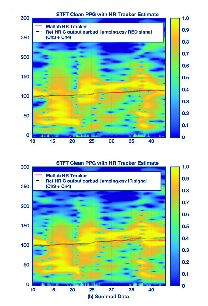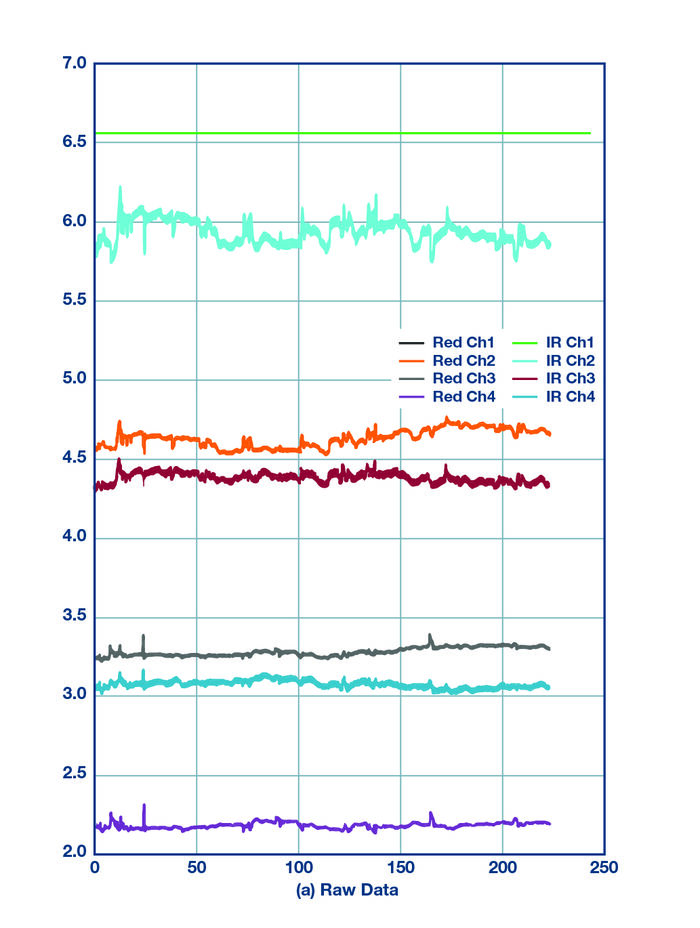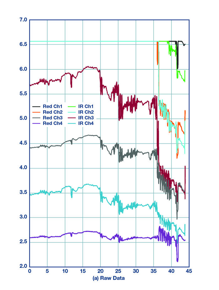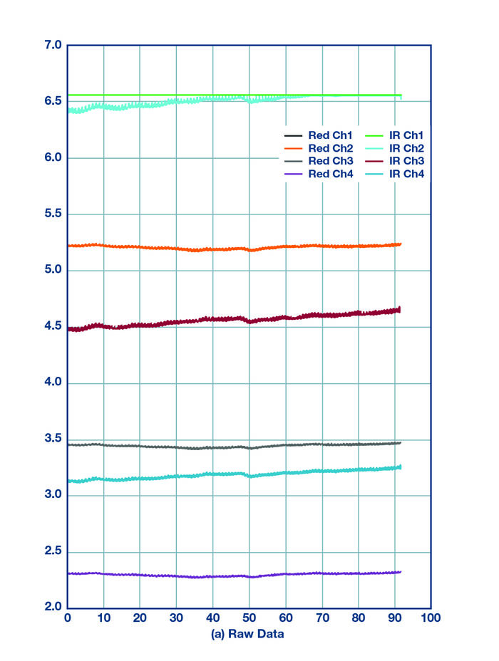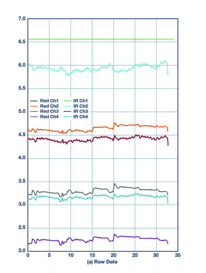 總之,在沒有運動的情況下,信號很強且沒有阻礙噪聲,因此算法能以高可信度確定心率。來自紅外通道的信號強于來自紅光通道的信號。