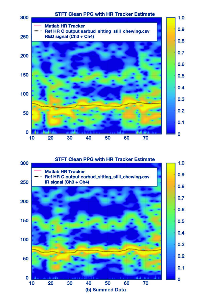 場景2引入了額外的咀嚼動作。記錄的頻譜如圖4所示。與測試場景1不同,這里可以清楚地看到運動偽像,其在信號中表現(xiàn)為跳躍。它們在通道總和中也變得清晰,不再表現(xiàn)出如此明顯不同的速率。然而,算法還是能夠在沒有運動傳感器額外幫助的情況下以高置信度正確地確定心率。有意思的是,紅外信號強度再次大于紅光通道的信號強度。