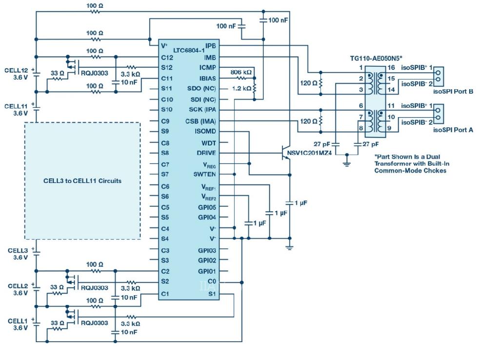 ADI 公司推出了一系列含有被動(dòng)電池均衡能力的多節(jié)電池監(jiān)控器。這些器件采用可堆疊架構(gòu),可以監(jiān)控?cái)?shù)百個(gè)電芯。每個(gè)器件可測(cè)量多達(dá) 12 個(gè)串聯(lián)連接的電芯,總測(cè)量誤差小于 1.2 mV。每電池單元 0 V 至 5 V 的測(cè)量范圍使其適用于大部分電池化學(xué)成分。LTC6804 如圖 2 所示。