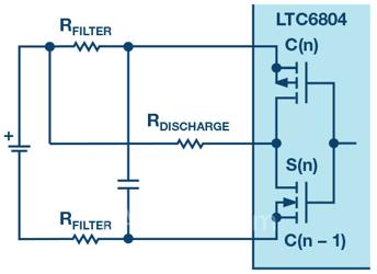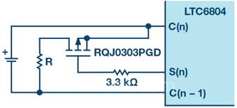 LTC6804 具有內(nèi)部被動(dòng)均衡功能 (圖 3);如果需要,它還可以配置外部 MOSFET(圖 4)。它還具有可選的可編程被動(dòng)均衡放電計(jì)時(shí)器,可為用戶提供更多的系統(tǒng)配置靈活性。