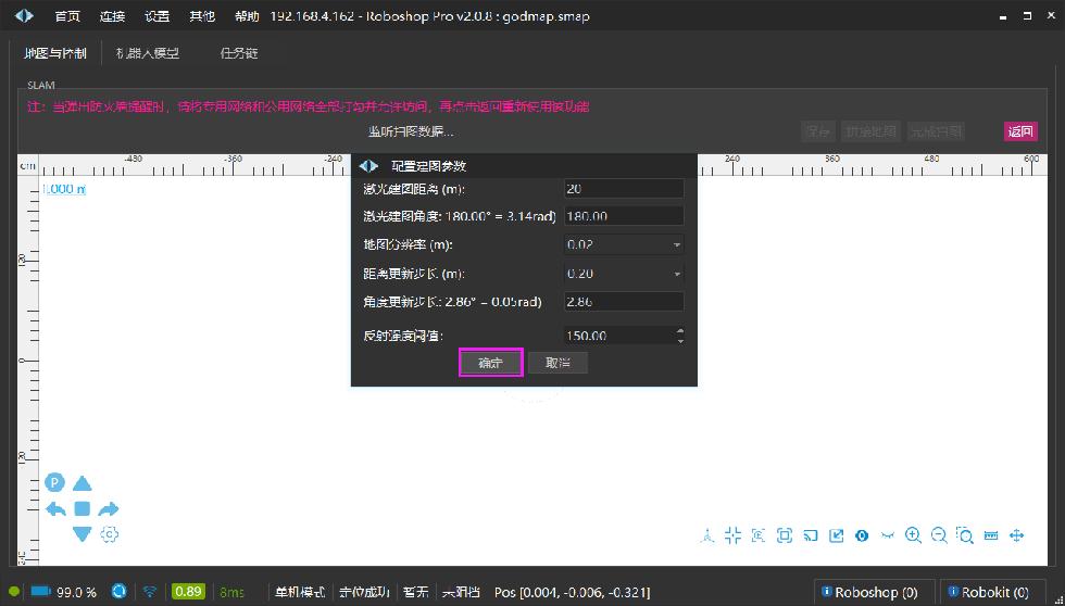 第一步:點(diǎn)擊 【地圖構(gòu)建】→【SLAM】,在彈出的界面中不做任何參數(shù)修改(一般情況下不需要修改該界面的參數(shù)),點(diǎn)擊【確定】按鈕。