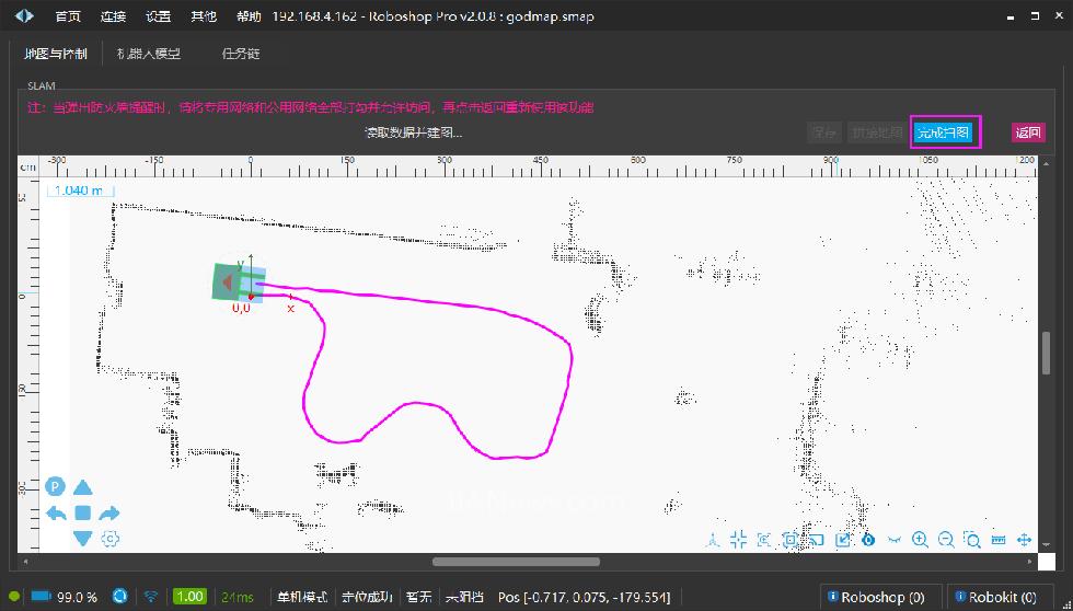 第二步:使用鍵盤按鍵 W(前)A(左)S(后)D(右)進(jìn)行機(jī)器人控制,使得機(jī)器人在場景中進(jìn)行運(yùn)動,完成掃圖后點(diǎn)擊右上角的【完成掃圖】按鈕。