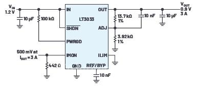LT3033的輸入電壓范圍是1.14 V至10 V, 輸出電壓可低至0.2 V,負(fù)載電流可達(dá)3 A。在滿負(fù)載時(shí)的壓差僅95 mV。工作時(shí)靜態(tài)電流為1.8 mA,關(guān)斷時(shí)降至22μA??捎捎脩?hù)設(shè)定的限流功能和熱保護(hù)使其具有高電流、低電壓應(yīng)用所必需的魯棒性。