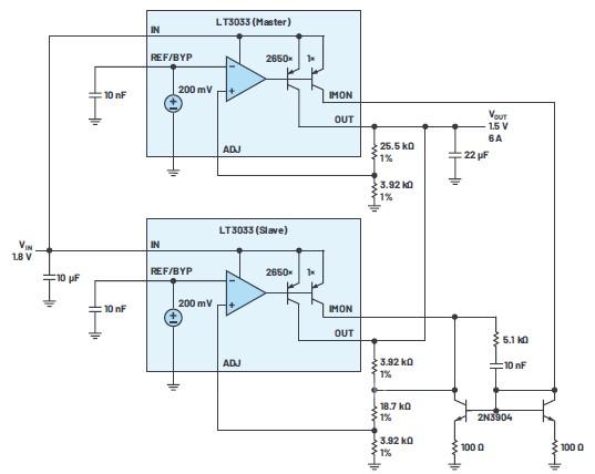 兩個(gè)LT3033并聯(lián)用于6 A應(yīng)用