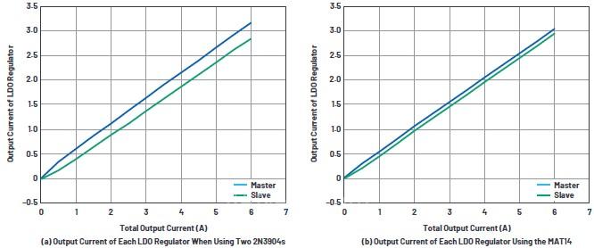 圖4比較了使用分立式和匹配的NPN器件時(shí)每個(gè)LDO穩(wěn)壓器的相應(yīng)輸出電流。與2N3904相比,MAT14電流鏡的電流失配率從5.3%降至1.6%。