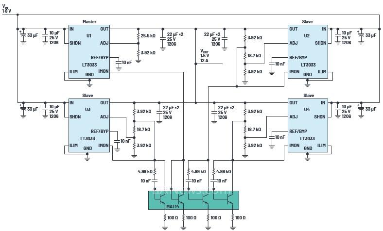 使用匹配元件并聯(lián)四個(gè)LT3033,以實(shí)現(xiàn)平衡均流和均勻散熱
