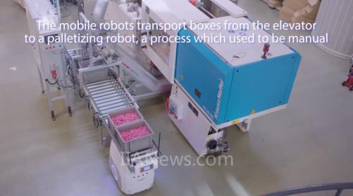 移動(dòng)機(jī)器人能夠自主乘坐電梯,到達(dá)指定樓層,然后將物料搬送至碼垛機(jī)器人,進(jìn)行下一步的加工處理。這些在往常來說,全部是需要依賴人工的。