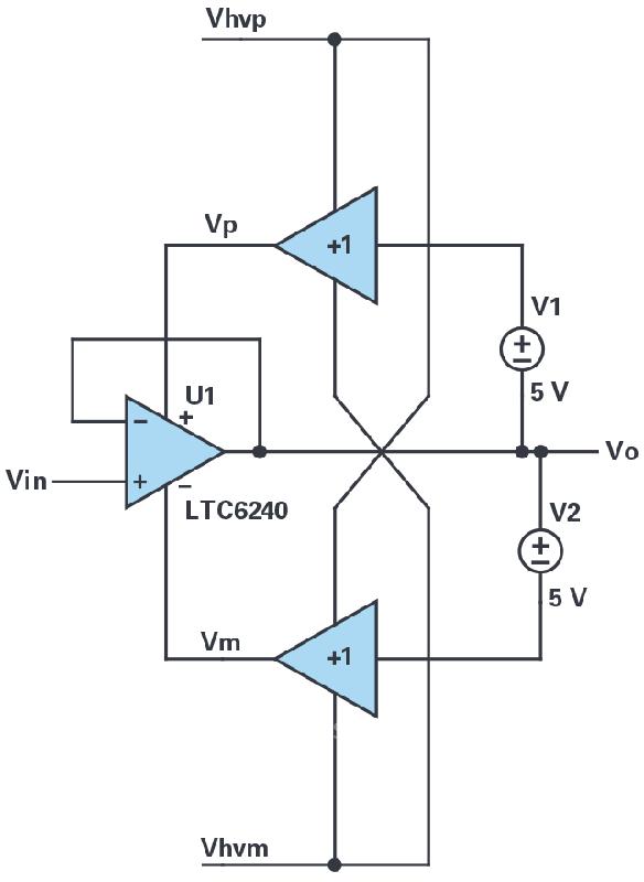 LTC6240由Vp(通過增益為+1的緩沖放大器保持輸出加5 V的值)和Vm(由另一個緩沖器驅(qū)動而保持輸出減5 V的值)供電。