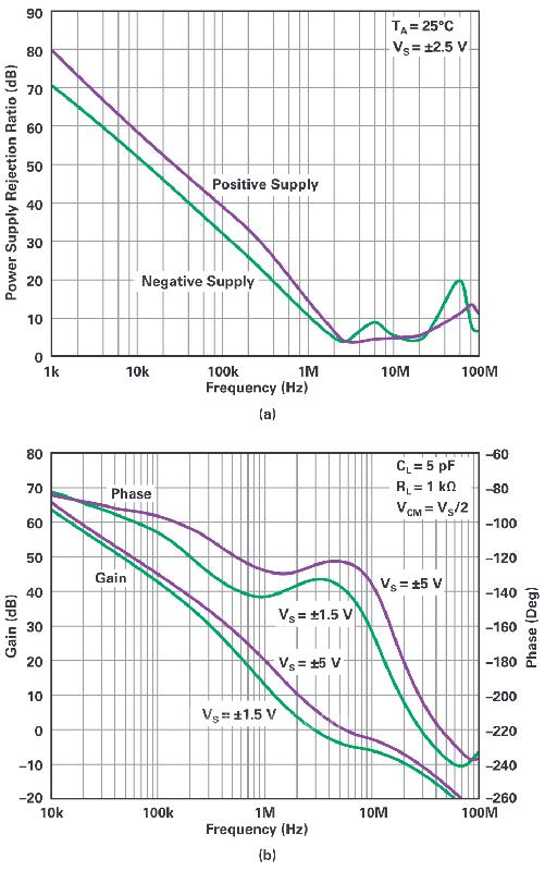 圖2.(a) LTC6240的PSRR,(b) LTC6240的開環(huán)增益
