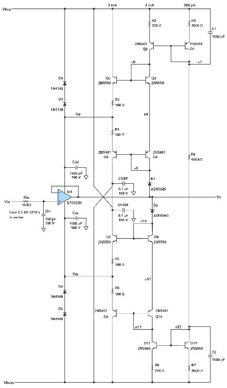 Q7至Q12形成與之前所述相當?shù)腣m減電源驅(qū)動器。請注意齊納電壓的不匹配是有意為之的:Vp比輸入/輸出高5V,Vm比輸入/輸出低3 V。這種不匹配使輸入電壓的中點位于LTC6240的電源限制輸入范圍以內(nèi),從而優(yōu)化壓擺波形。