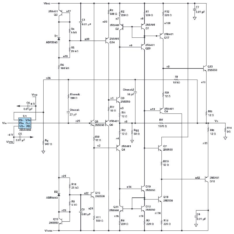 CFA的正輸入為節(jié)點n25,負輸入為n5(是的,這是輸入)。Rff和Rgg本身將內(nèi)部CFA的增益設置為約27。這種高增益可以將運算放大器輸出擺幅控制在±2 V。CFA可以設置為更高增益以進一步減輕控制放大器的負擔,但如此一來,CFA將損失帶寬,并且失真增加。總增益由Rf和Rg設置為20。Ctweak和Ctweak2配合Rf工作,從215 kHz以上的運算放大器整體反饋中消除CFA的相位滯后,從而增強運算放大器的穩(wěn)定性。