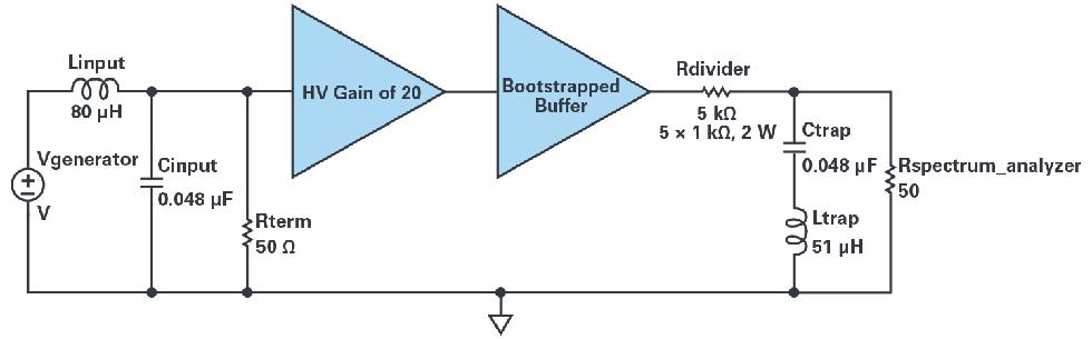 發(fā)生器通過一個低通濾波器(Linput和Cinput)驅(qū)動Rterm,濾波器衰減發(fā)生器的100 kHz諧波。失真由此改善到-113 dBc,低于要測量的電路。凈化后的信號由高壓放大器提升,并由緩沖器傳遞,緩沖器驅(qū)動分壓器。