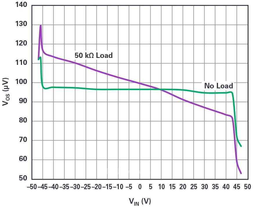 圖6.緩沖器的VOS與VIN的關系。Rl = 50 kΩ和∞