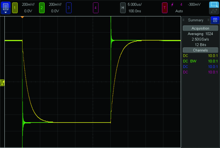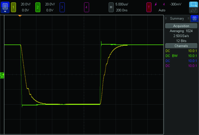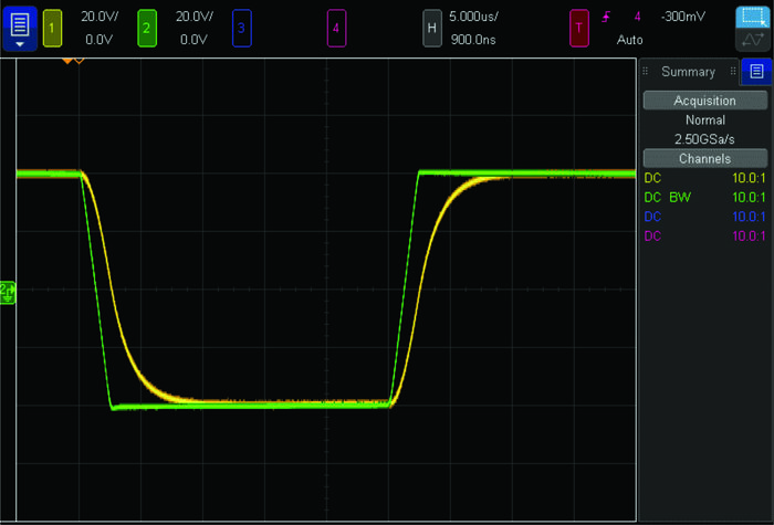 對綠色通道中的振鈴我要表示道歉,這是高壓放大器的輸出。它不是自行振鈴的,原因只是我使用的示波器探針和板對板接地很一般。黃色通道是緩沖器輸出,它是由Cin + Rin主導的簡單指數(shù)圖像。