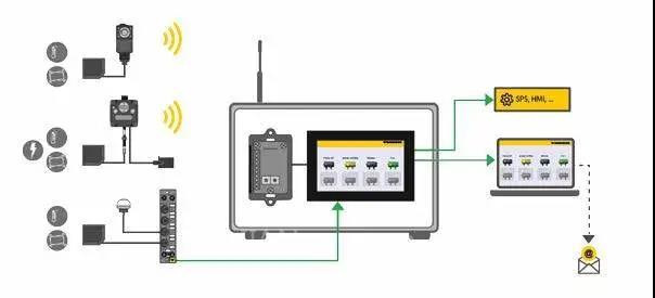 該方案可用于中央控制室等??梢詫o線網(wǎng)關(guān)與圖爾克TX700 HMI連接,使用VisuPro軟件顯示多個(gè)機(jī)器的狀態(tài)數(shù)據(jù),以便提取日志文件或配置警報(bào)。數(shù)據(jù)傳輸無需在HMI終結(jié),因?yàn)榭梢酝ㄟ^以太網(wǎng)連接到達(dá)其他目的地:例如在WebVisu顯示或發(fā)送自動(dòng)電子郵件通知的互聯(lián)網(wǎng)瀏覽器,以及內(nèi)部自動(dòng)化環(huán)境(PLC、HMI等)。