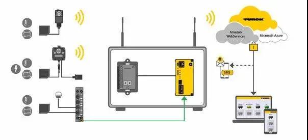 在該應(yīng)用示例的設(shè)計(jì)圖中,傳感器以無線方式或通過連接TX700 HMI發(fā)送溫度和振動(dòng)數(shù)據(jù),后者通過無線方式或電纜將數(shù)據(jù)轉(zhuǎn)發(fā)至PLC或云端