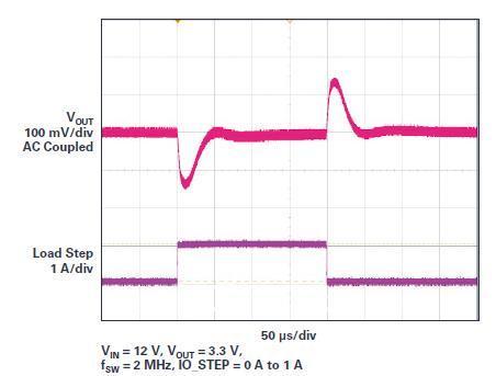圖3.使用最小輸出電容(2 μF × 4.7 μF陶瓷電容)時(shí),LTM8074提供快速瞬態(tài)響應(yīng)(12 VIN、3.3 VOUT)