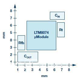 圖4.LTM8074的VIN最高可達(dá)40 V,輸出電流1.2 A,占用空間面積僅為4 mm × 4 mm