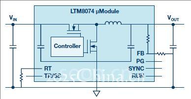輸入和輸出電容通常被集成到該電源模塊中,但有時(shí)候需要從外部連接。圖2顯示了采用了ADI公司新產(chǎn)品LTM8074的電路。