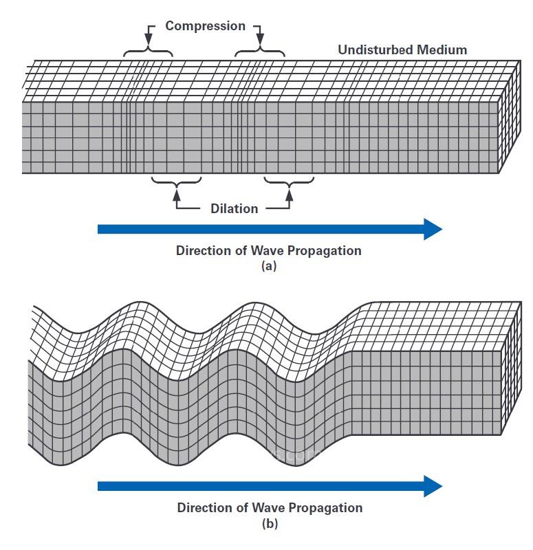 體波有兩種類型:縱波(P波)和橫波(S波)。P波以一系列壓縮波和稀疏波的形式沿傳播方向行進(jìn)。由于其傳播的性質(zhì),P波呈球面發(fā)散。雖然其波能衰減在所有類型的波中是最大的,但其速度最快,介于 5 km/s 至 8 km/s 之間??焖倌芰克p也使其成為破壞性最小的一類波。P波不僅可以通過表面?zhèn)鞑?,還可以通過水或流體傳播。