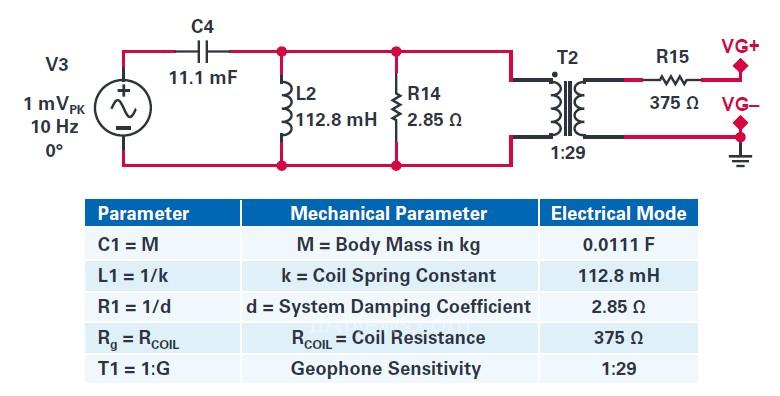 根據(jù)地震檢波器的機(jī)械規(guī)格可以創(chuàng)建等效電氣模型。圖4顯示了使用SM-6 4.5 Hz地震檢波器的機(jī)械參數(shù)的電氣模型。17