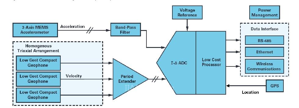 為了快速部署和實(shí)現(xiàn)地震網(wǎng)絡(luò),特別是針對(duì)城市和結(jié)構(gòu)監(jiān)測(cè)站,必須改變傳統(tǒng)地震儀的設(shè)計(jì)。遠(yuǎn)程儀器必須符合當(dāng)前儀器指南,以使現(xiàn)代地震信號(hào)測(cè)量符合既有數(shù)據(jù)標(biāo)準(zhǔn)并與之相關(guān)聯(lián)。但是,方案的成本和規(guī)模應(yīng)大大縮小。將小型地震檢波器和MEMS加速度計(jì)用作地震動(dòng)傳感器,再加上高性能ADC和數(shù)字信號(hào)處理器(DSP),是一種合理的解決方案。5