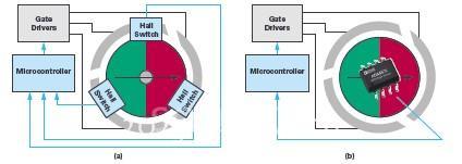 顧名思義,無刷直流電機沒有電刷觸點,需要使用電機位置傳感器(MPS)來測量定子與轉(zhuǎn)子之間的相對位置,以確保定子線圈按正確順序通電。電機位置傳感器在啟動時至關(guān)重要,因為此時微控制器沒有可用的反電動勢來確定轉(zhuǎn)子和定子的相對位置。