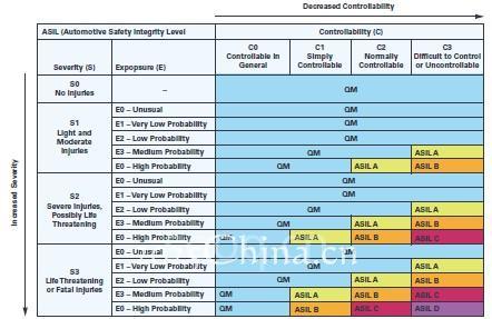 必須對系統(tǒng)實施安全和風險分析,以確定系統(tǒng)的ASIL等級。ASIL等級是通過審查系統(tǒng)在運行期間潛在危險的嚴重程度、暴露程度和可控性來確定的(見圖2)。