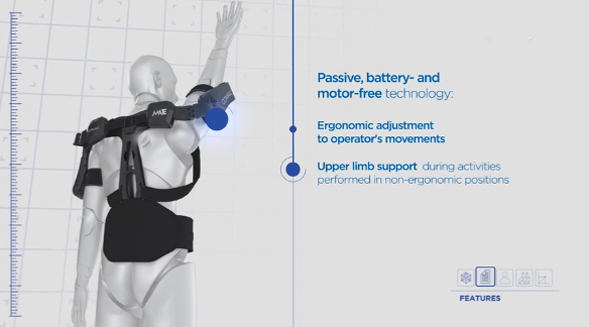 在用于輔助工人的可穿戴式機(jī)器人技術(shù)中,MATE被動(dòng)型外骨骼機(jī)器人無(wú)需配備電池或電機(jī),可跟隨手臂運(yùn)動(dòng)提供姿勢(shì)支撐,而不受阻力或產(chǎn)生錯(cuò)位。這可以使肩部主肌群的壓力降低30%。