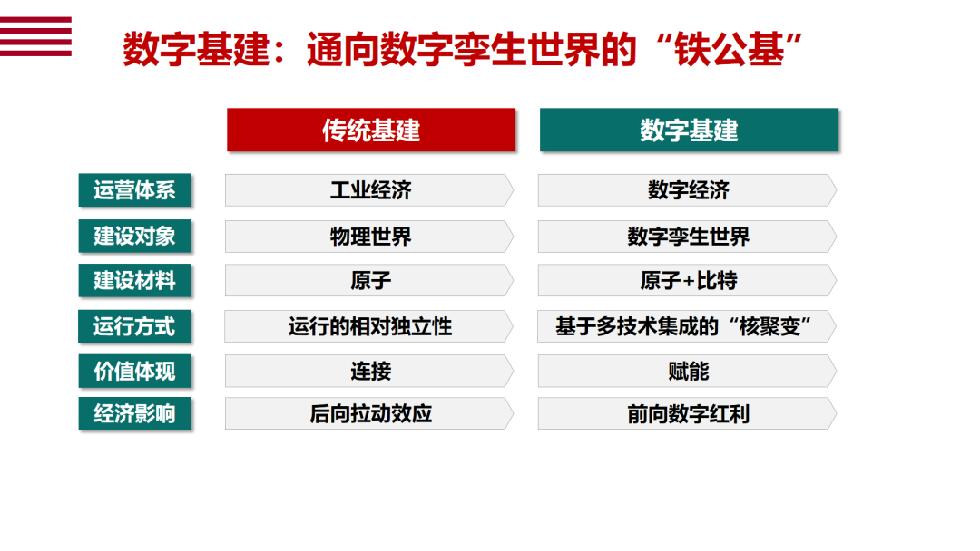 五是從價(jià)值體現(xiàn)來看,鐵路、公路、水運(yùn)、電力,它們的核心價(jià)值在于連接,實(shí)現(xiàn)物流、人流、能量流的流通;數(shù)字基建的核心價(jià)值在于賦能,通過智能工具、精準(zhǔn)決策優(yōu)化資源配置效率。