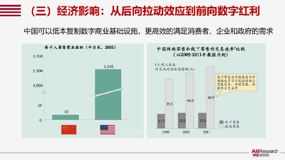 數(shù)字基建更多關(guān)注的是如何從后向拉動(dòng)效應(yīng)到前向數(shù)字紅利。中國由于消費(fèi)互聯(lián)網(wǎng)的快速發(fā)展,可以構(gòu)建一個(gè)更加便捷、大規(guī)模使用的數(shù)字商業(yè)設(shè)施,可以低成本地復(fù)制數(shù)字商業(yè)基礎(chǔ)設(shè)施,更高效地滿足消費(fèi)者、個(gè)人、企業(yè)和政府的需求。2005年中國每千人零售營業(yè)面積只有18平方米,美國是1105平方米,但是在數(shù)字互聯(lián)網(wǎng)的時(shí)代,每1元的投入在零售領(lǐng)域,能帶來的銷售額線上是49.6元,而線下是12.5元。互聯(lián)網(wǎng)、電子商務(wù),使得滿足消費(fèi)者需求的整個(gè)投入產(chǎn)出比更高了,用了更少的基礎(chǔ)設(shè)施的資源,投入人力、物力、財(cái)力,創(chuàng)造了更多的價(jià)值。這是它的數(shù)字紅利的效應(yīng)。