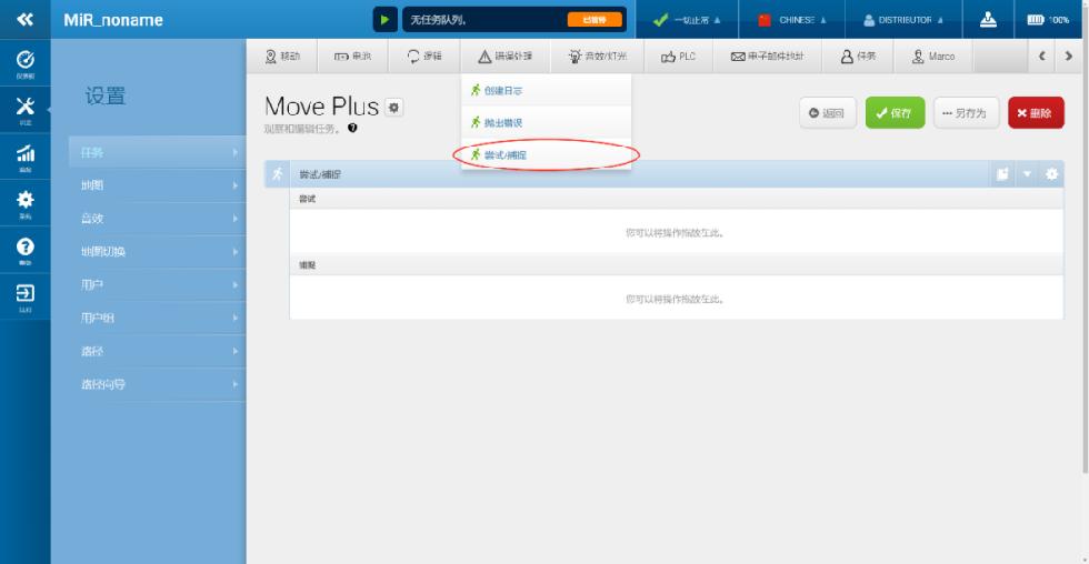 捕捉中的【播放音效】,當(dāng)【嘗試】中的移動(dòng)失敗后會(huì)跳轉(zhuǎn)到捕捉指令內(nèi)并播放一段提示音提醒現(xiàn)場人員加以關(guān)注。