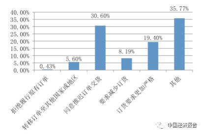 中國(guó)制造業(yè)已經(jīng)深度嵌入全球制造業(yè)分工體系,是全球制造業(yè)產(chǎn)業(yè)鏈中的關(guān)鍵環(huán)節(jié),但疫情的爆發(fā)在中斷中國(guó)制造企業(yè)的穩(wěn)定供給的同時(shí),也在迫使全球產(chǎn)業(yè)鏈上的其他國(guó)家企業(yè)不得不尋求將供應(yīng)鏈向其他國(guó)家轉(zhuǎn)移,這無(wú)疑增加了中國(guó)制造企業(yè)國(guó)際訂單的不確定性,對(duì)中國(guó)制造企業(yè)競(jìng)爭(zhēng)優(yōu)勢(shì)的持續(xù)發(fā)展構(gòu)成挑戰(zhàn)。調(diào)查結(jié)果顯示,雖然只有0.43%的國(guó)際買家以中國(guó)疫情為由拒絕履行原有訂單,但轉(zhuǎn)移訂單的比例卻達(dá)到了5.6%,還有8.19%的國(guó)際買家在尋求減少訂貨,這其中也許存在有訂單轉(zhuǎn)移的因素在內(nèi)。同意中國(guó)企業(yè)推遲訂單交貨的占30.6%。具體見(jiàn)圖6。