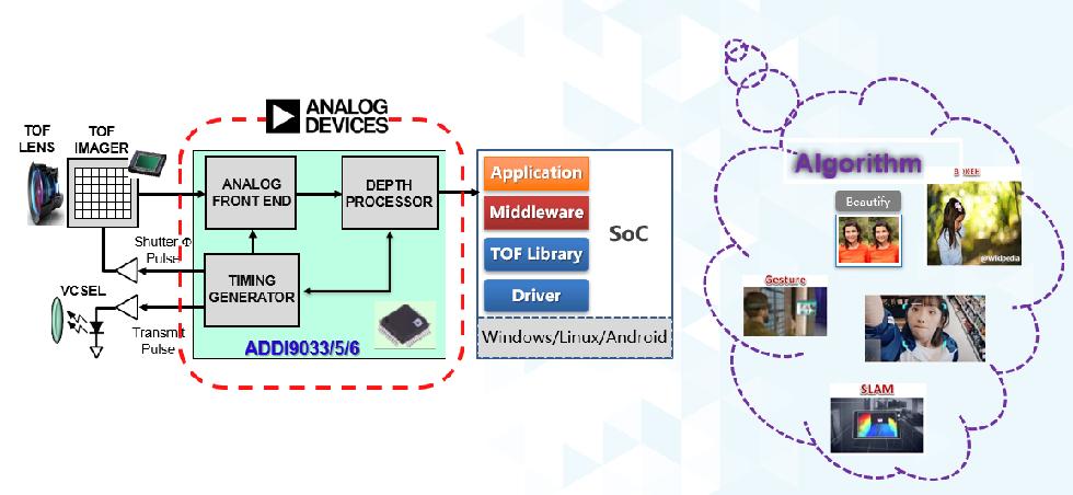 具體來看,ADI的ToF解決方案使用了高性能ToF CCD和集成了12位ADC、深度處理器(將來自CCD的原始模擬圖像信號處理成深度/像素數(shù)據(jù)),以及高精度時鐘發(fā)生器(為CCD和激光器生成驅(qū)動時序)的ToF模擬處理前端。ToF CCD主芯片ADDI903x系列具有很好的性能,傳感器將采集的光信號轉(zhuǎn)換成電信號,運(yùn)用深度計算把最終距離信息送到SOC處理,然后將數(shù)據(jù)提供給算法適配,整個過程涉及傳感器、鏡頭、發(fā)射器件、平臺、應(yīng)用等。對硬件廠商而言,需要和模組廠配合打造小型化、集成度高的產(chǎn)品來適配應(yīng)用廠商,然后適應(yīng)不同的應(yīng)用場景。
