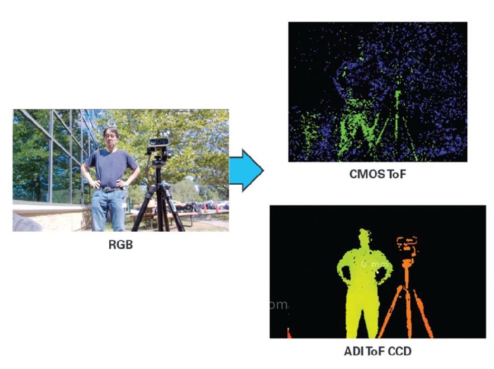 戶外環(huán)境下CMOS ToF系統(tǒng)(850 nm光源)與ADI的CCD ToF系統(tǒng)在識別人與三腳架的效果對比。