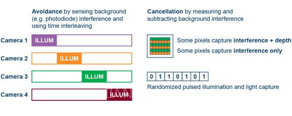 試想如果多個自主式機(jī)器人在同一大型倉庫里分揀貨物,或者兩輛自動駕駛的汽車同時接近交叉路口,ToF攝像頭無法消除相互光源的干擾,那么使用ToF技術(shù)進(jìn)行精確深度測量的應(yīng)用范圍將會嚴(yán)重受限(ADI發(fā)展路線圖預(yù)計將實(shí)現(xiàn)64個攝像頭同時近程檢測的場景)。就算是在消費(fèi)端,隨著各種應(yīng)用增多,設(shè)備間的干擾也將是實(shí)實(shí)在在的現(xiàn)實(shí)問題。因此,ADI認(rèn)為ToF系統(tǒng)中的防干擾或消除干擾能力將會越來越重要。據(jù)透露,ADI目前采用了一項正在申請專利的算法,它能夠避開或消除所有無關(guān)的光信息,僅使用自身激光源的光信息,所以能給出正確的深度信息。深度處理器采用偽隨機(jī)化算法和特殊的圖像處理功能,可以消除多機(jī)干擾。因此,可以在同個環(huán)境中使用多個ADI ToF系統(tǒng)。