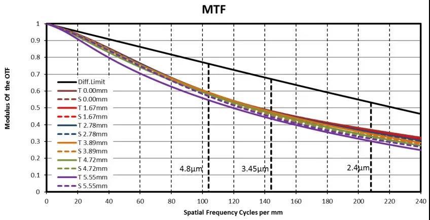 超高分辨率,最小可支持2.1μm像元,MTF≥20%@240lp/mm