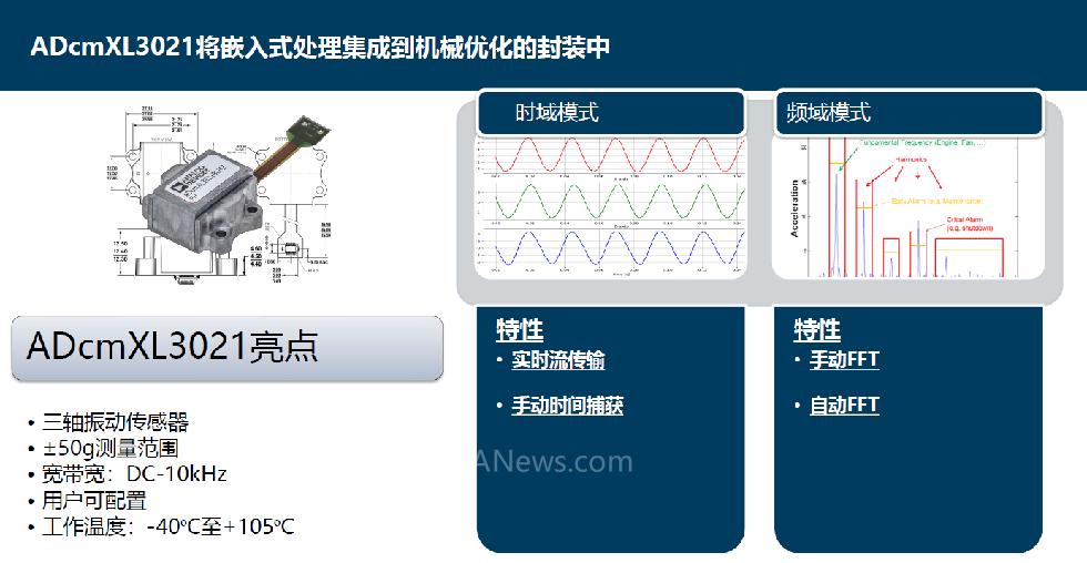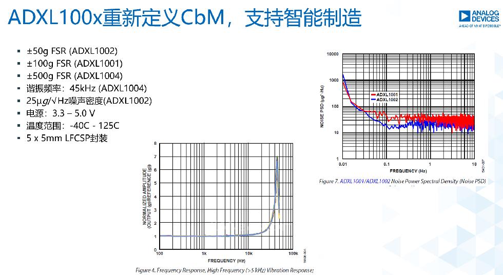 值得一提的是,如果沒有高精度的數(shù)據(jù)輸入,再強(qiáng)大的AI系統(tǒng)都不能發(fā)揮其功能,對(duì)于工業(yè)狀態(tài)監(jiān)測(cè)來說也是如此。加速度計(jì)是工業(yè)振動(dòng)監(jiān)測(cè)的關(guān)鍵傳感器,其關(guān)鍵指標(biāo)是低噪聲和寬帶寬,因此ADI在工業(yè)狀態(tài)監(jiān)測(cè)應(yīng)用中率先推出了多個(gè)系列的高性能MEMS加速度計(jì)產(chǎn)品。例如,ADXL100x系列單軸加速度計(jì)針對(duì)工業(yè)狀態(tài)監(jiān)控應(yīng)用而優(yōu)化,測(cè)量帶寬高達(dá)50kHz,g值范圍高達(dá)±100g,并且擁有超低的噪聲性能,旋轉(zhuǎn)機(jī)械中發(fā)生的主要故障(如套筒軸承損壞、對(duì)準(zhǔn)誤差、不平衡、摩擦、松動(dòng)、傳動(dòng)裝置故障、軸承磨損和空化)都在ADXL100x系列狀態(tài)監(jiān)控加速度計(jì)的測(cè)量范圍以內(nèi)。
