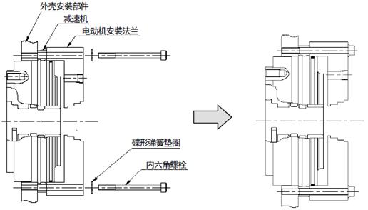 (1)將電動(dòng)機(jī)安裝法蘭的安裝孔對(duì)準(zhǔn)減速機(jī)(外殼部)的安裝孔和外殼安裝部件的內(nèi)螺紋位置,將電動(dòng)機(jī)安裝法蘭安裝到減速機(jī)上。