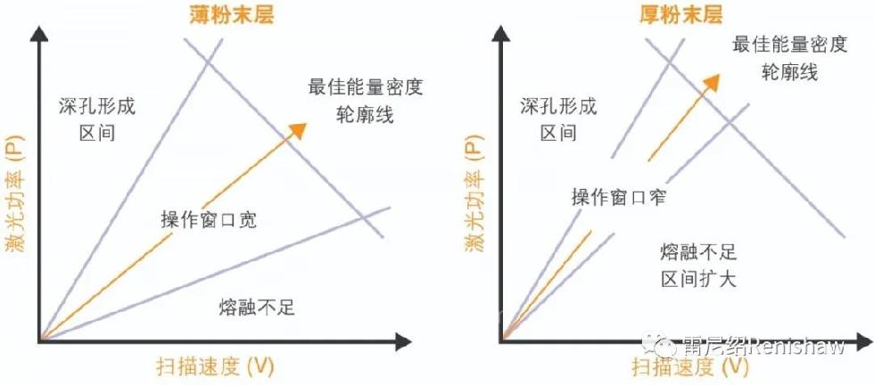 顯然,粉末層越厚就要求激光能量滲透更深,才能確保與下方的金屬層完全融合。為了獲得最優(yōu)的能量輸入以完全熔融材料, 隨著層厚增加,必須相應增加每層的能量輸入。如此一來,能量密度輪廓線變得更加陡峭。